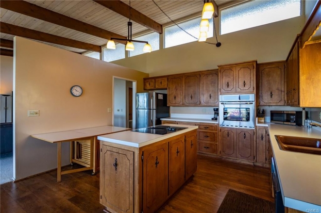 Are you looking for that Huge Ocean View? Open concept living? 450 sq ft deck for viewing fireworks at 4th of July? Single level living? This home, a successful Vacation Rental, has 1,400 sq ft 2 bedroom / 2 bathroom on main level, plus a 1 bedroom/1 bath 836 sq ft living space below, also with great ocean views and 450 sq ft deck. There is a one car attached garage for the upper level. Ceilings in the open living,dining and kitchen, range from 9’ to 15’ and the sliding glass doors are 8’ tall. This home is move in ready, and a tremendous opportunity for the designer looking for a place to make your mark, and have every penny add value. The vacation rental license allows you income when you are not here. There is also "dry storage" area under the house that adds hundreds of sq ft for potential shop, wine cellar, etc. Call your Realtor today to see this unique opportunity!
